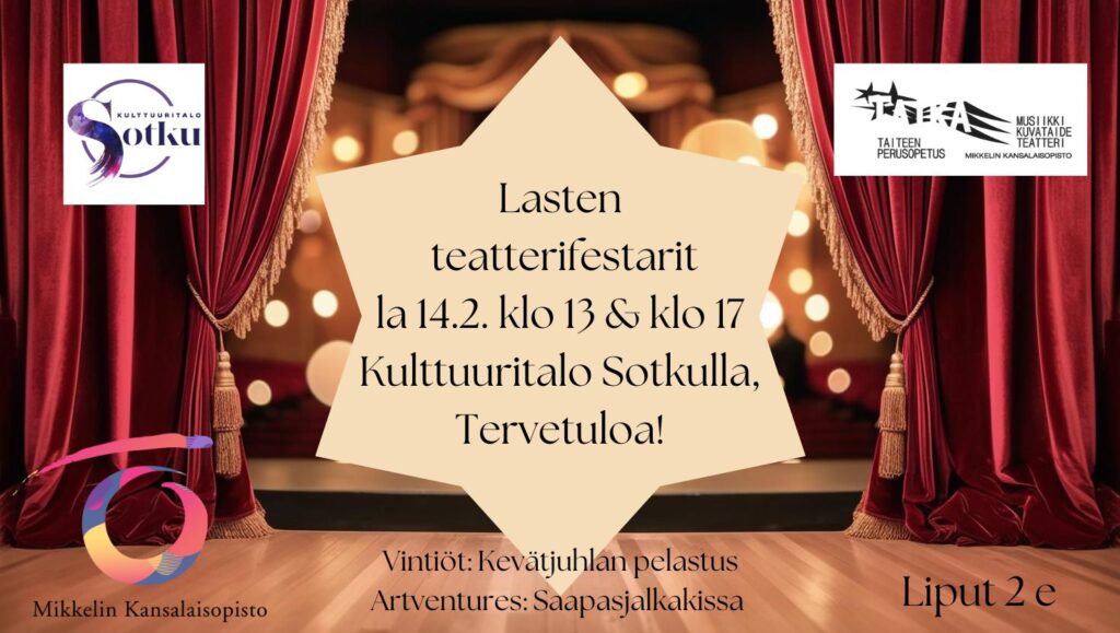 Kulttuuritalo Sotkulla (Jääkärinkatu 9, Mikkeli) alkaa monipuolinen tapahtumakevät, jossa tarjolla on teatteria ja kuvataidetta. Esille pääsevät niin harrastajateatteriryhmät kuin eri-ikäiset taiteen perusopetuksen opiskelijat teatterin ja kuvataiteen ainealueilta. Tapahtumien järjestäjänä toimii Mikkelin kansalaisopisto.